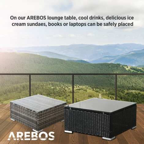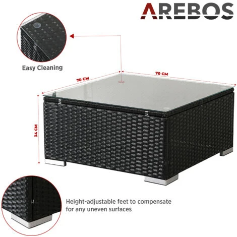 Ya sea en el patio o en el balcón, esta mesa de 70 x 70 x 34 cm de AREBOS garantiza agradables horas de sol. El tablero está hecho de cristal resistente de 5 mm y se fija con ventosas.
