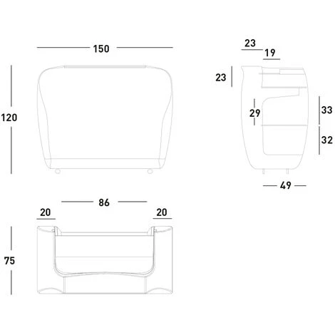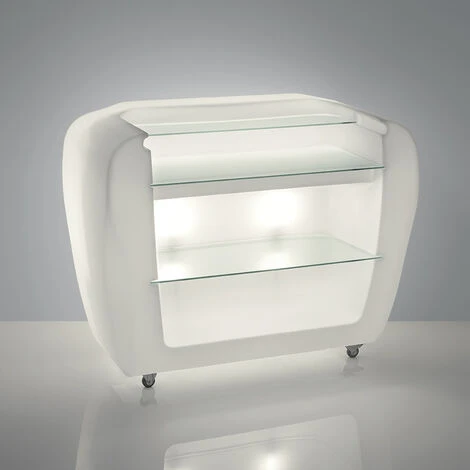 La barra de bar con una línea cautivadora y minimalista, combina funcionalidad con belleza estética: equipada con ruedas giratorias y de bloqueo y completa con estantes internos, es fácil de manejar y reposicionar.