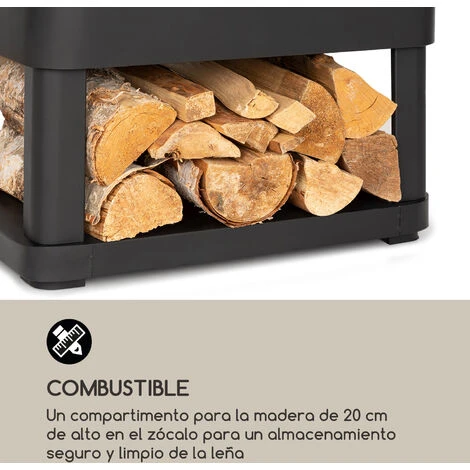 Combustible: Compartimiento de madera de 20 cm de alto en la base para un almacenamiento seguro y limpio de los troncos.