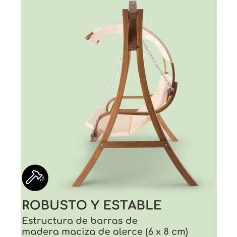 La hamaca estilo Hollywood Maui de Blumfeldt le pone fácil olvidarse del ajetreo de la vida. Con una superficie de asiento de 110 cm y un acolchado de 4cm podrá hamacarse tanto solo como acompañado. El toldo abovedado acompaña el movimiento otorgando protección contra los rayos directos del sol, sin importar donde coloque la hamaca. La hamaca, extremadamente estable, está construida con tablas de madera maciza, cadenas anti óxido de acero inoxidable y tornillos recubiertos en zinc y permite una carga máxima de hasta 250 Kg. El toldo blanco crema y las maderas laqueadas de alerce garantizan el espíritu veraniego.