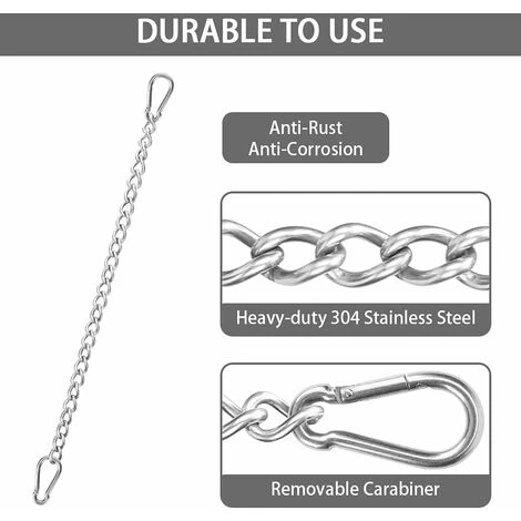 Material premium: hecho de acero inoxidable resistente, ayuda a proteger contra la oxidación y brinda resistencia a la corrosión. Peso: 350 g. La longitud total de la cadena de la silla colgante es de 62 cm; cada mosquetón mide