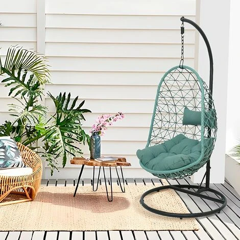 Sillón colgante para jardín o terraza modelo Bolonia fabricado en acero y en ratán sintético. con un acabado en verde y antracita. Ideal para disfrutar y relajarse de forma cómoda en el exterior de su hogar.