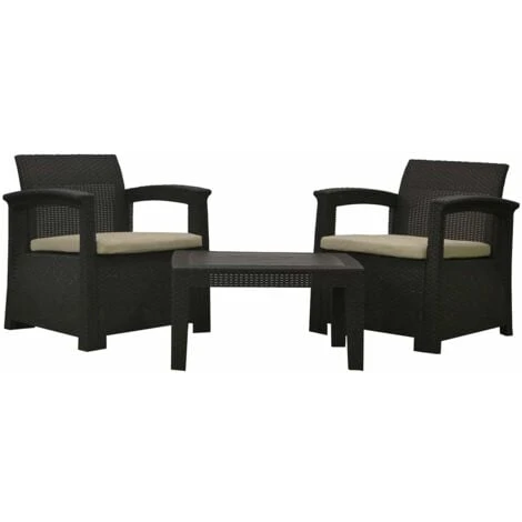 Elegante y funcional conjunto de muebles de jardín formado por 2 sofás individuales y una mesa. Está fabricado con resina (polipropileno inyectado) y tiene un acabado de imitación de ratán. La estructura de los muebles de color marrón chocolate con cojinería en tono beige. Los cojines tienen funda de poliéster de 180 gr/m2. Las medidas de los sofás individuales 69,4×62,5×75 cm y la mesa 70×50,5×38 cm. Coloca este conjunto en tu jardín, porche o terraza y consigue el descanso y comodidad que necesitas para pasar largos ratos con amigos y familia.