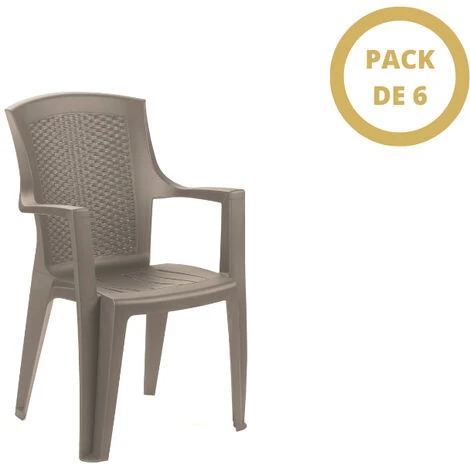 Sillones: 60 × 55 × 91 cmSet de resina taupe imitación ratán con cojines de asiento reversibles taupe beige. Compuesto por una mesa rectangular de 150×90 cm y 6 sillones apilables de resina taupe.
