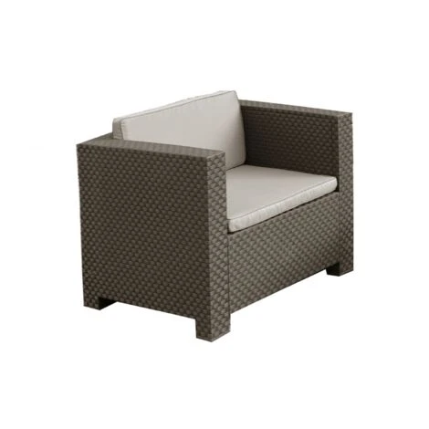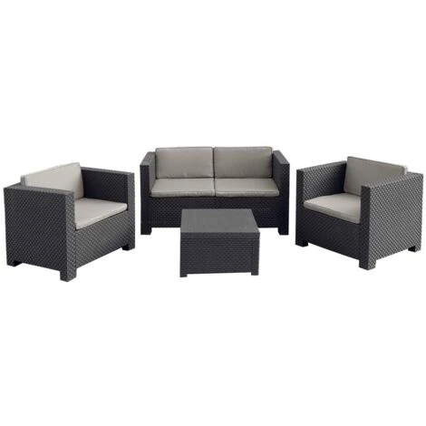 Conjunto de muebles de jardín de alta calidad, con un diseño moderno de resina con trenzado símil ratán que incluye 2 sillones, sofá de 2 plazas, mesa baja y cojines de asiento y respaldo.