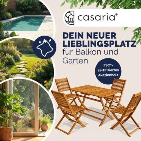 El juego de asientos Sydney light, esta hecho de madera maciza de acacia con certificado FSC®, y convence por su elegante diseño y funcionalidad. El conjunto de jardín esta compuesto de una mesa y cuatro sillas plegables.