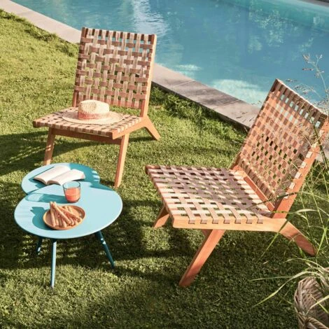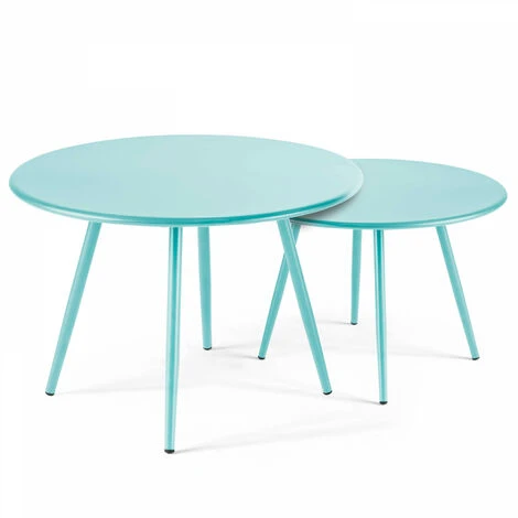 Juego de 2 mesas de centro nido – Mesas de centro redondas de metal para jardín Elige un mobiliario de jardín elegante y moderno con la pareja de mesas de centro nido Palavas. El diseño de las mesas redondas permite deslizar la mesa pequeña bajo la grande y así modular el tamaño de su salón: tan estéticas como prácticas, las mesas nido de metal aportan un toque decorativo único. Con una estructura 100% acero y protegidas contra la oxidación, las mesas de centro nido son perfectas para completar un conjunto de jardín o terraza.