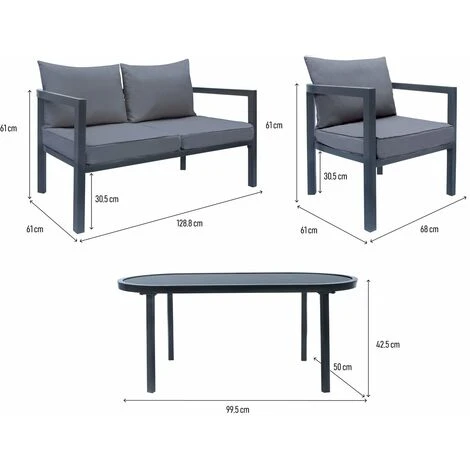 Estructura:Gris. Color:Gris. Metal. 4 plazas. Cojín:Cojín de espuma de 9 cm de grosor. Cubierta de mesa:Vidrio. Dimensiones del tablero:99,5 x 50 cm Grosor: 4,5 mm. Mesa/Mesa de centro:99. 5 x 50 x 42. 5 cm. Sillón:68 x 61 x 30. 5 cm. Altura del sofá:30. 5 cm. Anchura del sofá :61 cm. Profundidad del sofá :128. 8 cm. 61 cm. Consejos de limpieza:El tejido de poliéster es un material fácil de limpiar. Basta con utilizar agua y jabón para limpiar los muebles. 160 kg. Ventajas del producto:Antióxido Robusto y fácil de mantener Resistente al agua. Embalaje:1 bulto : – 1,29 x 0,7 x 0,26 m, 48,7 kg.