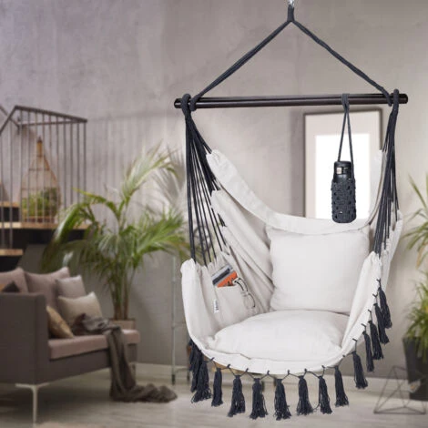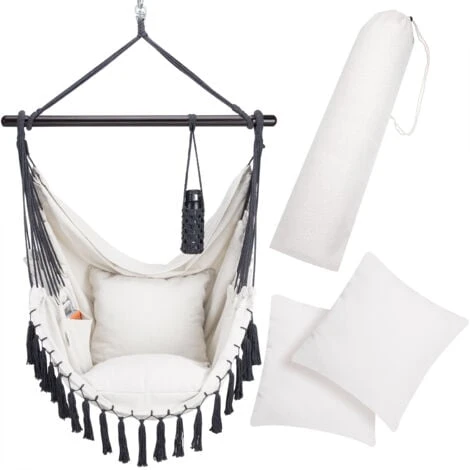 El sillón colgante es multifuncional, se puede utilizar tanto en el interior como en el exterior. La cesta del asiento de la hamaca está cubierta de mimbre de algodón natural resistente a la intemperie, por esto los rayos solares, la suciedad y el agua no pueden dañar la silla. Gracias a su gran estabilidad y al mástil de madera extra grueso de 3,8 cm de diámetro, el asiento colgante tiene una capacidad de carga de hasta 150 Kg.