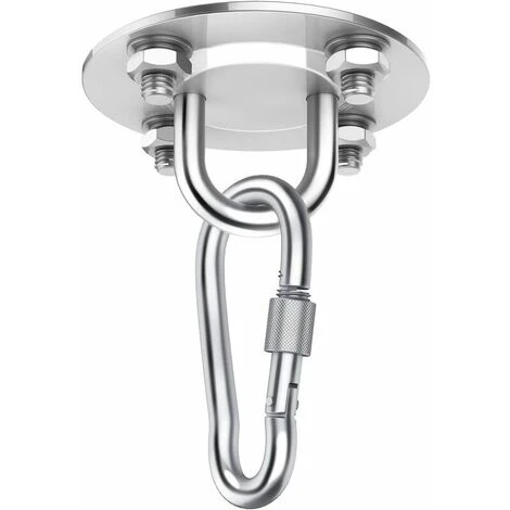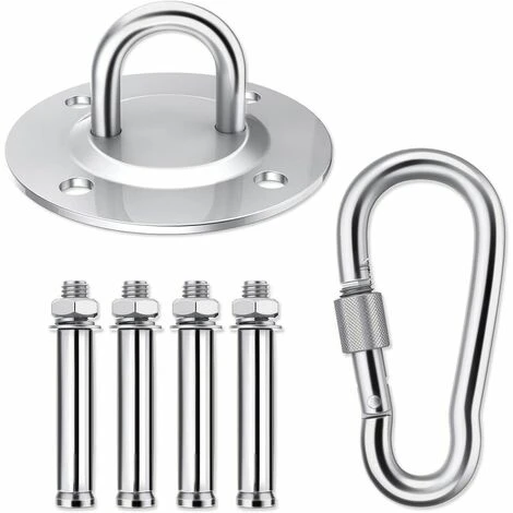 Descripción del producto Contenido del paquete: 1 * Gancho 1. Material: Con acero inoxidable resistente a la corrosión, el soporte es adecuado para instalación en interiores y exteriores. Esta suspensión está hecha para durar. 2. Soporte de techo profesional de acero inoxidable Perfecto para silla colgante, lámpara colgante, columpio, hamaca, saco de boxeo, entrenador de cabestrillo, toalla de yoga, dosel, entrenador de cabestrillo, silla colgante, cueva colgante, asiento colgante. 3. Diámetro del soporte de techo: 90 mm, peso del paquete: aproximadamente 430 g, capacidad de carga de hasta 400 kg 4. Volumen de suministro: 1 x soporte de techo, 4 x tacos metálicos (juego para techos de hormigón macizo), 1 x mosquetón con dispositivo de seguridad, 1 x instrucciones de montaje detalladas (alemán),