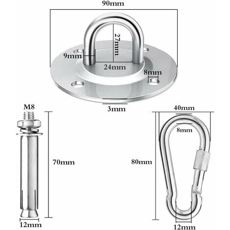 Gama de aplicaciones: muy adecuado para colgar sillas, candelabros, columpios colgantes, hamacas, sacos de arena, yoga, entrenamiento con tirachinas, etc. Es una opción ideal para conexión fija y colgante.
