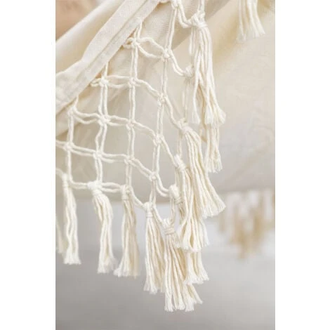 Te presentamos la Hamaca de Jardín Kotga, un producto de fiel representación al estilo natural, versátil, funcional y muy confortable. Está confeccionada con una mezcla de algodón y poliéster de alta calidad, resultando una hamaca perfecta tanto para el exterior como para el interior de tu hogar. Incluye una bolsa que te permitirá guardarla y llevártela donde necesites. Puedes combinarla con nuestros cojines para que resulte mucho más confortable y crear tu propio espacio de relax con el máximo estilo. Los cojines de las imágenes no están incluidos. ¿A qué esperas para disfrutar de tus momentos de relax en el jardín o terraza con Kotga? Recomendamos limpiar en seco y evitar el uso de lavadora y secadora, así como de productos químicos. Dimensiones (Alto x Ancho x Profundo): ∼30 cm x ∼120 cm x cm IMPORTANTE: El servicio estándar puerta a puerta no incluye la subida al domicilio, tanto en la entrega como en la recogida, de esto deberá hacerse cargo el cliente. Cabe la posibilidad que el repartidor de manera voluntaria ayude en la subida de la mercancía (siendo esto totalmente voluntario por el repartidor y la empresa de transporte y ajeno a Sklum).El montaje tampoco se encuentra incluido.