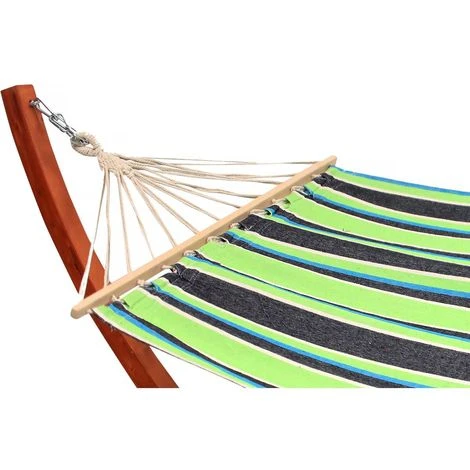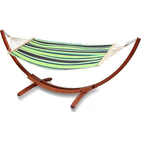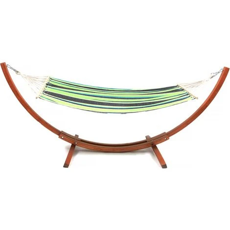 Descripción:Hamaca de madera con lona de algodón Dallas Para 1 persona. Longitud total:315 x 115 x 120 cm Dimensiones del asiento: 100 x 200 cm. Dimensiones máximas / mínimas de la suspensión: 315/270 cm. longitud de la barra de madera:Barra de separación: 100 cm. Materia:Estructura: madera de alerce – color de madera natural Lona: algodón – Color verde mixto. Carga máxima:120 kg. Peso del producto completo:22 kg. Empaquetado:Distancia recomendada desde el suelo: 50 cm. Se puede colgar del techo La lona se lava a mano. Carga maxima (kg):120. Embalaje:1 bulto: – 1,58 x 0,37 x 0,13 m, 24 kg.