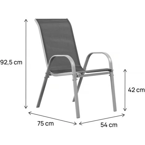 Descriptivo:Los sillones Córdoba le encantarán por su robustez y elegancia combinadas con un toque de modernidad. Disponibles en diferentes colores, le darán la posibilidad de personalizar su jardín según sus gustos y deseos. Para que sus sillas se conserven el mayor tiempo posible, han sido tratadas con un tratamiento anti-UV, anti-óxido y resistente al agua. Además, le aconsejamos que los proteja con una funda protectora. Color:Textileno: Gris oscuro- Estructura: Plateado. Estrcutura:Acero/Textileno. Materia:Acero/Textileno. Dimensiones del producto:53. 5 x 75 x 92 cm. Diseño sobrio –Moderno – Resistente – Apilables – Fácil de limpiar – las sillas se entregan desmontadas. Peso máximo soportado:150 kg. Embalaje:1 bulto: – 0,75 x 0,1 x 0,71 m, 10,63 kg.