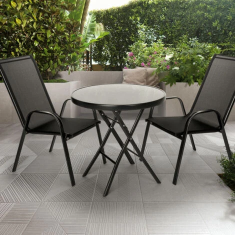 Las 2 sillas son muy cómodas para el uso diario gracias a los reposabrazos y al respaldo curvado, y están fabricadas en acero de gran calidad, resistente e inoxidable, con un revestimiento de textileno impermeable y transpirable que las hace aptas estar al aire libre, resistentes a los rayos UV, a la humedad y a los agentes atmosféricos, ideales para entretenerse y disfrutar de agradables conversaciones, leer o tomar una copa. Resistente, pero lo suficientemente ligera como para trasladarla a donde se quiera, la mesa de centro también es adecuada para estar al aire libre gracias a su construcción de acero con recubrimiento en polvo. Presenta una superficie de cristal templado de 60 cm de diámetro que se apoya con firmeza en la base de patas cruzadas. Al ser una pesa plegable es una excelente solución para ahorrar espacio, ya que permite transformar el espacio en una zona de comedor en un solo movimiento y, al mismo tiempo, permite ahorrar espacio al utilizar la mesa solo cuando la necesita.