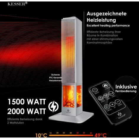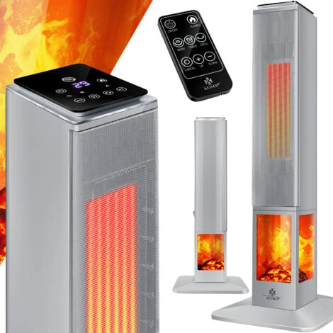 KESSER Calefactor radiante de torre controlable por mando a distancia para interior y exterior con 2 niveles de potencia (1500W y 2800W), temporizador 1-24h, protección contra la inclinación, calefactor cerámico PTC pantalla táctil LCD y función de oscilación, acogedora ventana de chimenea