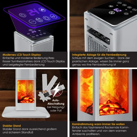 Si el mando a distancia no está al alcance de la mano, también puede accionar la torre de calefacción directamente en el propio aparato, con temporizador incluido. Con una opción de almacenamiento práctica e integrada en la parte trasera, siempre sabrá dónde está su mando a distancia y ya no podrá perderlo. La pantalla LCD también le ofrece una amplia gama de opciones de ajuste. Aquí puede encender y apagar el aparato directamente a través de una pantalla táctil, ajustar la ventana de la chimenea, activar y desactivar la oscilación, programar temporizadores y aumentar o disminuir el nivel.