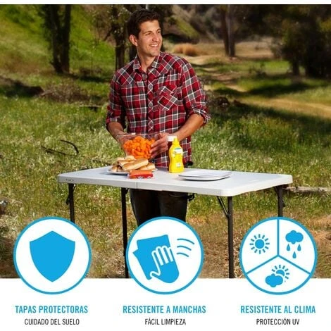 Mesa plegable para interior y exterior LIFETIME con medidas desplegada 122 x 61 cm. Patas con 4 alturas regulables 56-61-74-91 cm para adaptarse al uso. Plegada mide 62 x 5 x 61 cm y su peso máximo soportado es 340 kg. Fabricada de material ultrarresistente: polietileno de alta densidad con protección UV y armazón de acero recubierto, resiste manchas y condiciones climatológicas adversas. Diseño ligero y versátil, propone todas las opciones que necesitas en una mesa.