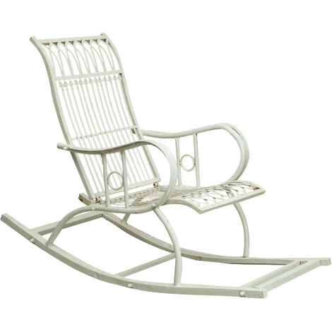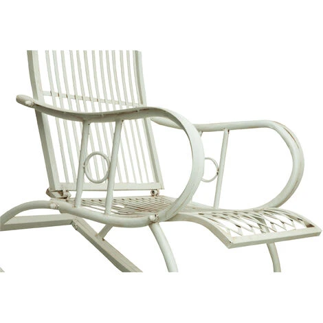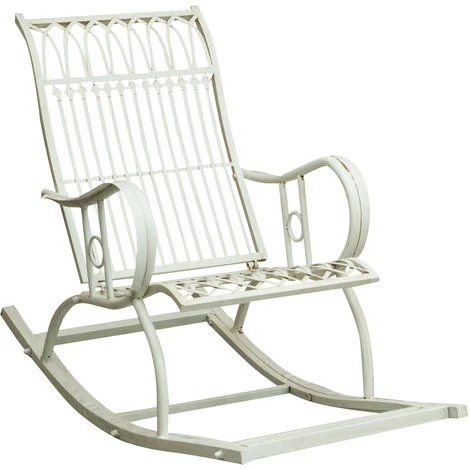 Mecedora de hierro forjado con apoyabrazos. Es un complemento de mobiliario cómodo, relajante, funcional y elegante, que puede ser usado en todo tipo de ambientes. Medidas 127x64x90 cm.