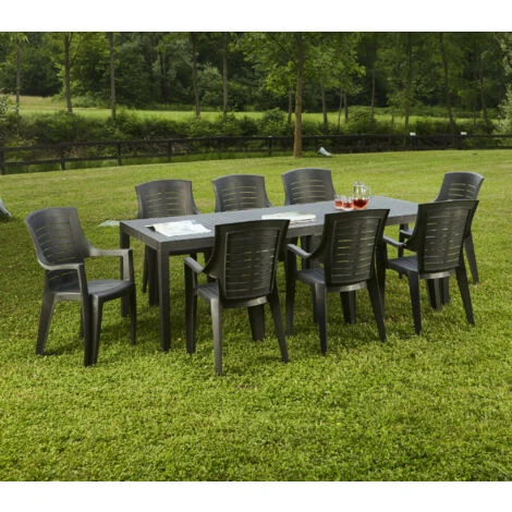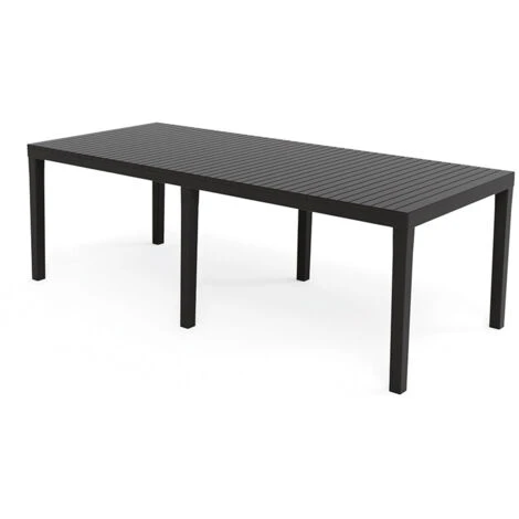 ESTRUCTURA Y USO – Mesa de exterior con estructura resistente en plástico reforzado – Equipada con una extensión central de 70 cm y 2 patas adicionales que garantizan su estabilidad – Producto con acabado efecto listón, que garantiza comodidad y estilo – Producto perfecto para amueblar con elegancia tu exterior espacio, jardín, balcón o terraza – Producto versátil que se puede combinar con varios tipos de sillas, también se puede utilizar en interiores – Producto que ahorra espacio ideal para albergar hasta 10 personas para el almuerzo.