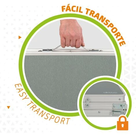 - Estable y plegable: sistema de fijación abierto y cerrado, patas plegables con tacos antideslizantes, patas extraíbles recogidas debajo del tablero