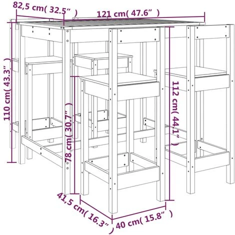- Dimensiones de la mesa alta: 121 x 82,5 x 110 cm (ancho x profundo x alto)