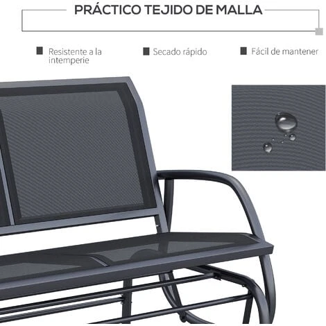 Este fantástico balancín compacto para terraza es lo que te hace falta para relajarte al aire libre en el exterior de tu casa. Su estructura ligera pero robusta al mismo tiempo te ofrece un asiento para dos personas que soporta un máximo de 200kg. Su mecanismo ofrece un deslizamiento suave para que te balancees de forma cómoda y sencilla. Su tela de malla transpira por lo que sentarse en él resulta muy cómodo. Cuando no vayas a utilizarlo por largos periodos, podrás desmontarlo y guardarlo fácilmente. No lo dudes más y vive tu terraza, jardín o balcón al 100% gracias a este fantástico balancín compacto para exteriores.