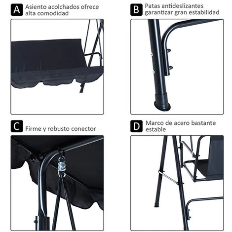 ¿Estás buscando un balancín para tu jardín? Te presentamos este práctico columpio de Outsunny. Tiene capacidad para 3 personas, y cuenta con un asiento con respaldo acolchado en grueso relleno de algodón para mayor comodidad. La estructura es de acero tubular, resistente y muy estable. El toldo incluido permite ajustar el ángulo para protegerte del sol en los días más calurosos. Su elegante diseño combinará fácilmente con el estilo de tu jardín o terraza.