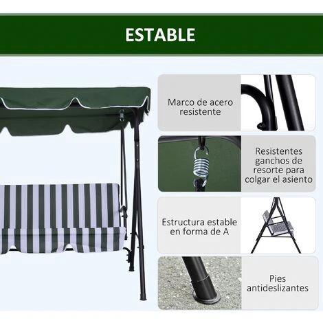 ¿Estás buscando un balancín para tu jardín? Te presentamos este práctico columpio de Outsunny. Tiene capacidad para 3 personas, y cuenta con un asiento con respaldo acolchado en grueso relleno de algodón para mayor comodidad. La estructura es de acero tubular, resistente y muy estable. El toldo incluido permite ajustar el ángulo para protegerte del sol en los días más calurosos. Su elegante diseño combinará fácilmente con el estilo de tu jardín o terraza.