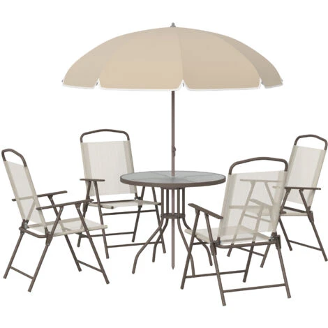 ¡Echa un vistazo a este juego al aire libre de Outsunny y completa tu jardín! Incluye 4 sillas plegables y una mesa con encimera de vidrio que cuenta con un orificio para una sombrilla. Además, ¡la sombrilla está incluido! Este conjunto de mesa y sillas de jardín de un marco de acero que es fuerte y resistente al óxido, y la malla transpirable de las sillas es transpirable para todo el años. Es una gran adición a tu patio para que disfrutes del tiempo libre con tus familiares y amigos.