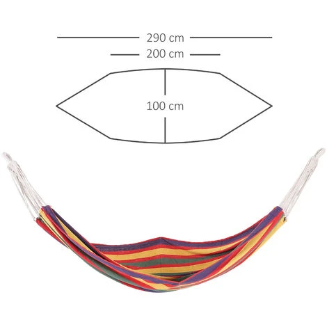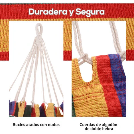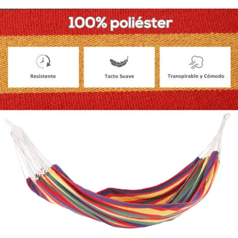 ¿Has visto esta hamaca de rayas multicolores de Outsunny? Ideal para disfrutar de una tarde tomando el sol o relajarte con un buen libro a la sombra de los árboles o en un soporte para hamacas (no incluido). Confeccionada en tela de algodón 100% con fuertes nudos de cuerda a cada lado, soporta hasta 120 kg y es lavable a 30ºC.
