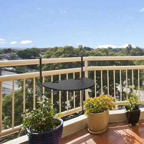 La mesa plegable BASTIAN se puede colgar fácilmente en barandillas. La altura es ajustable en 3 niveles diferentes y es perfecta también para balcones estrechos, ya sea en tu piso o en tu casa de veraneo.