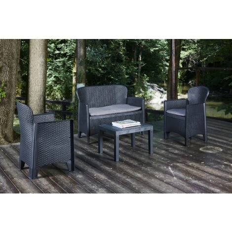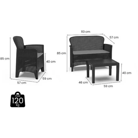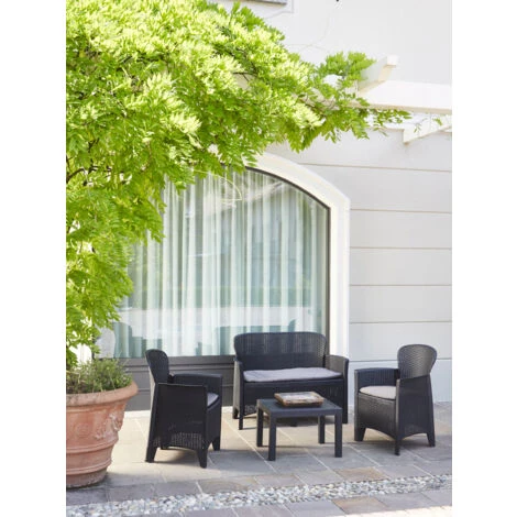 ESTRUCTURA Y USO – Artículo formado por un elegante conjunto de exterior para dos personas, compuesto por dos sillas con respaldo y apoyabrazos, un sofá de dos plazas y una mesa de centro, cojines incluidos – Los amplios y acogedores asientos garantizan relax y confort en tu propia casa – Zona de estar perfecta para amueblar tu espacio exterior o interior, gracias a la composición de plástico reforzado con efecto ratán que realza su estilo – Perfecta para brunchs y aperitivos en la terraza, porche, jardín o para relajarse en la piscina.