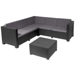 Conjunto de mueble de jardín de alta calidad, con un diseño moderno de resina con trenzado símil ratán que incluye un sofá de 3 plazas, un sofá de 2 plazas y una mesita a juego. Además es resistente a los rayos UV. incluye instrucciones de montaje en el interior de la caja.