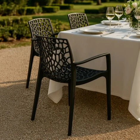 La línea de sillones Gruvyer de la colección Grand Soleil es una de las soluciones Made in Italy más populares y solicitadas para amueblar con estilo cualquier tipo de ambiente, ya sea interior o exterior. De hecho, la silla está fabricada con Highmopp, un polímero brillante patentado con excelentes cualidades que la hacen duradera, excepcionalmente robusta y resistente a los fenómenos climáticos más adversos. Además, está certificada por Contrat para uso profesional y cumple perfectamente con los requisitos típicos de los lugares públicos, como la practicidad y la funcionalidad. Su diseño inspirado en un panal de abejas lo hace extremadamente moderno, además de fácil de combinar con cualquier tipo de mobiliario particular o profesional, adaptándose perfectamente a salones, cocinas, jardines, bordes de piscinas y terrazas de cualquier estilo decorativo, facilitando además el flujo de agua en caso de lluvia. El amplio asiento es agradablemente confortable gracias a los reposabrazos, al igual que el respaldo ergonómico, especialmente diseñado para asegurar una completa relajación en todas las ocasiones, y en la parte inferior de la espalda tiene una pequeña curva que ofrece un apoyo adicional a la zona lumbar. El sillón Gruvyer Arm también se puede apilar en varias unidades para poder colocar varias sillas una encima de otra y facilitar el orden y la distribución cuando haya que montar la zona. Cómoda, versátil y apta para diversos contextos de uso, gracias a la infinidad de colores disponibles podrás personalizar al máximo los espacios de tu casa o negocio y acompañar la silla Gruvyer Arm con mesas de todo tipo.