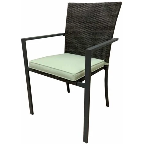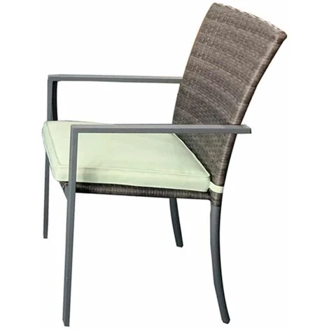 La silla está fabricada de acero y resina que imita al ratán, aportando un toque decorativo con su característico trenzado. Esta silla incluye como extra, un cojín para ofrecer una sensación superior y se puede fijar por la parte trasera. Además, tiene reposabrazos y su respaldo es alto para que la espalda se mantenga recta.