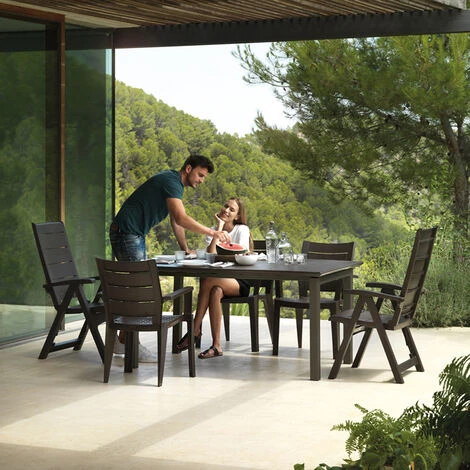 Silla Legno, de color antracita, con acabado efecto madera. Monoblock de gran envergadura y robustez, con respaldo alto y curvo para una gran comodidad. Silla apilable, apta para uso exterior e interior. Fabricada en España con materiales reciclados.