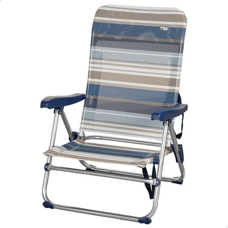 Silla de playa baja Aktive Beach diseño azul a rayas blancas con 5 posiciones, se tumba hasta quedar horizontal y se pliega por completo. Medidas 46,5 x 50 x 85 cm, con estructura tubular de 2 cm, asiento de textileno de 26 cm de alto y distancia entre reposabrazos de 61 cm de ancho. Tejido cómodo, flexible y de secado rápido. Incluye 1 asa para transportarla cómodamente y cuenta con tacos antideslizantes en las patas para mayor seguridad.