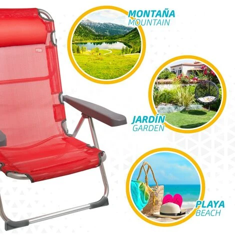 Silla plegable alta Aktive Beach con respaldo reclinable en 5 posiciones regulable con los reposabrazos ergonómicos. Fabricada con estructura resistente de alumino y asiento textileno en color rojo, tiene unas medidas de 48 cm de ancho, 60 cm de largo y 90 cm de alto; medidas plegada 77 cm de ancho y 62 cm de alto; altura asiento: 28 cm y distancia entre los reposabrazos: 62 cm. Incluye cojín y asa de transporte para transportar contigo a cualquier parte. Además incorpora topes antivuelco. Soporta un peso máximo de 110 kg.