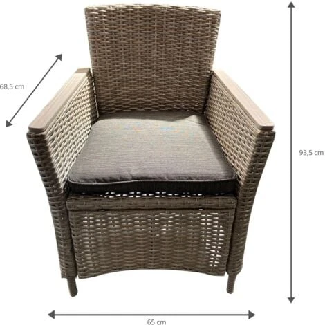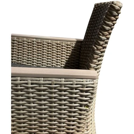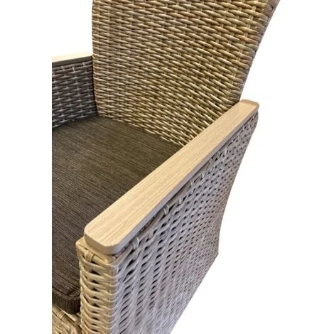 Consigue la comodidad que buscas con este sillón de resina imitación ratán y estructura de metal interior que aporta solidez al asiento y el ratán sintético un toque fresco gracias a su tono que imita la madera. Tiene apoyabrazos y un gran asiento con amplia superficie para sentarse a leer cómodamente, tomar una bebida o relajarse. El respaldo alto permite apoyar la espalda prácticamente al completo, por lo que no querrás usar otro asiento. Además, incluye un cojín mullido para colocar en la base y hacerlo aún más confortable.