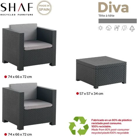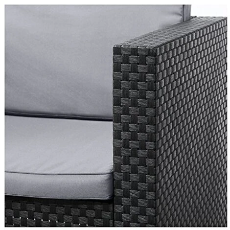Hecho de plástico reciclado de alta calidad sin componentes metálicos para evitar la oxidación, en un elegante color grafito con una textura que imita el trenzado de ratán, este set para dos personas incluye dos sillones individuales (74cm x 66cm x 72cm), cojines de asiento y respaldo acolchados, y una mesa baja de centro (57cm x 57cm x 34cm).