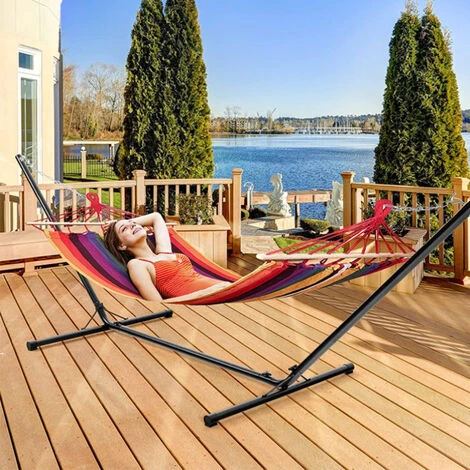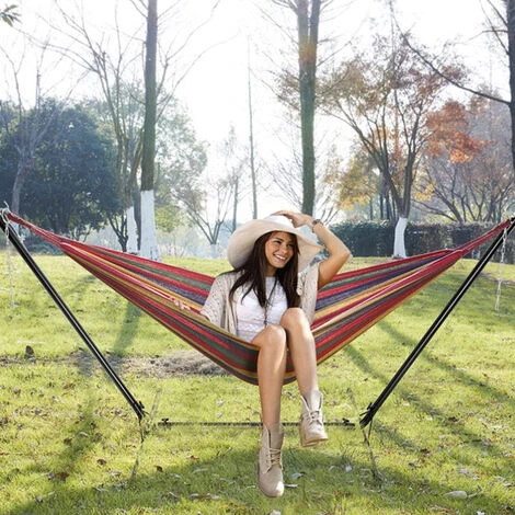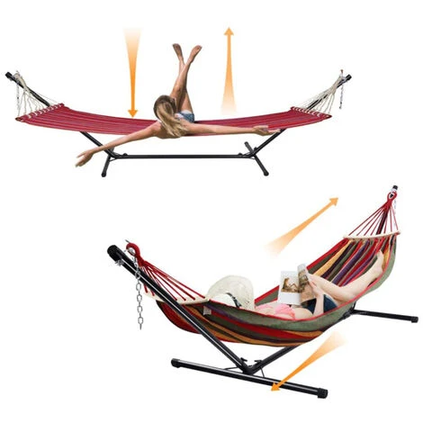 Lea o tome el sol de forma segura en el jardín o el patio, y es ligero y portátil. Se puede instalar en cualquier lugar donde se necesite una hamaca.