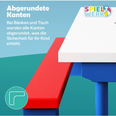 El juego de muebles para niños está hecho de un material robusto, resistente y fácil de mantener y limpiar. Además, para mayor seguridad y tranquilidad, todos los bordes son redondeados. El conjunto de jardín infantil tiene una gran superficie de apoyo y, por tanto, un soporte estable.