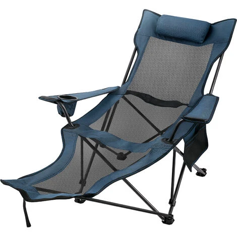 La silla plegable para campamento cuenta con reposapiés de malla y puede sentarse o echarse en esta hermosa tumbona para un descanso.