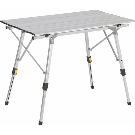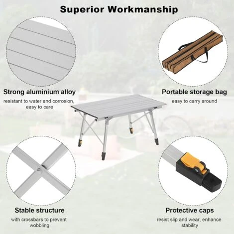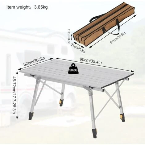 - MESA CAMPING SÓ.LIDA &. ESTABLE: El marco de mesa está. fabricada con aluminio aleado só.lido. má.s con barras cruzadas que evita el meneo y permite soportar un peso de 50 kg cuando se distribuye uniformemente. Cada pata equipa con un tapó.n antideslizante. evitando eficazmente el desgaste de patas y asegurando un larga vida ú.til.